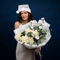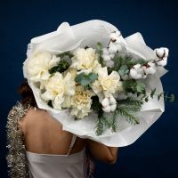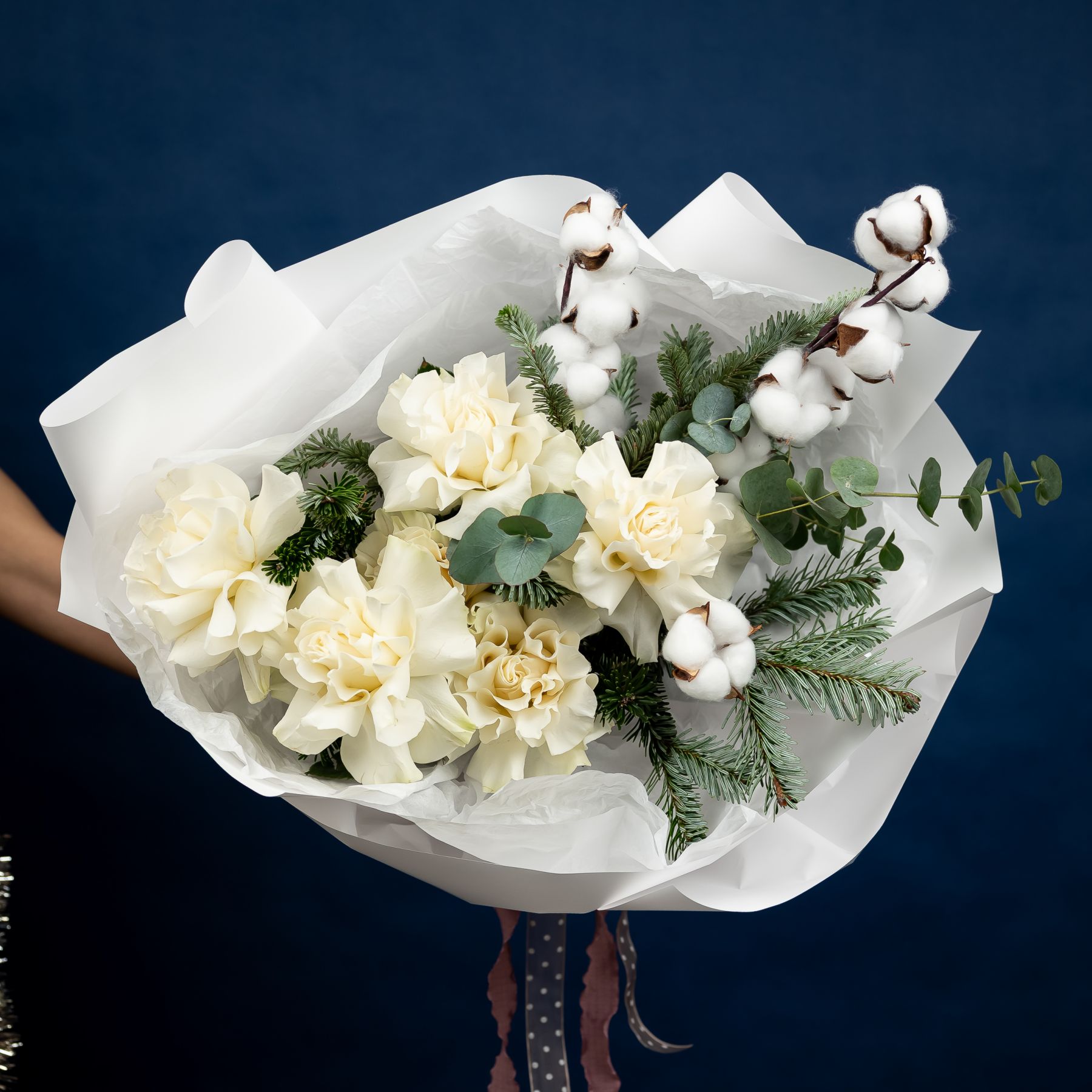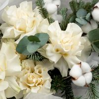 Стильный букет из роз с ароматной датской елью в оформлении.
