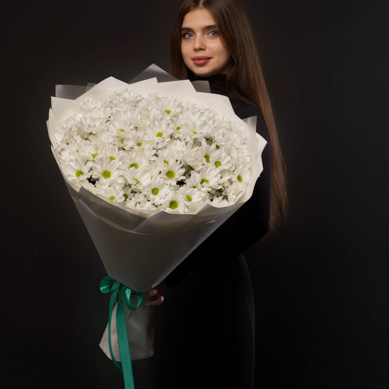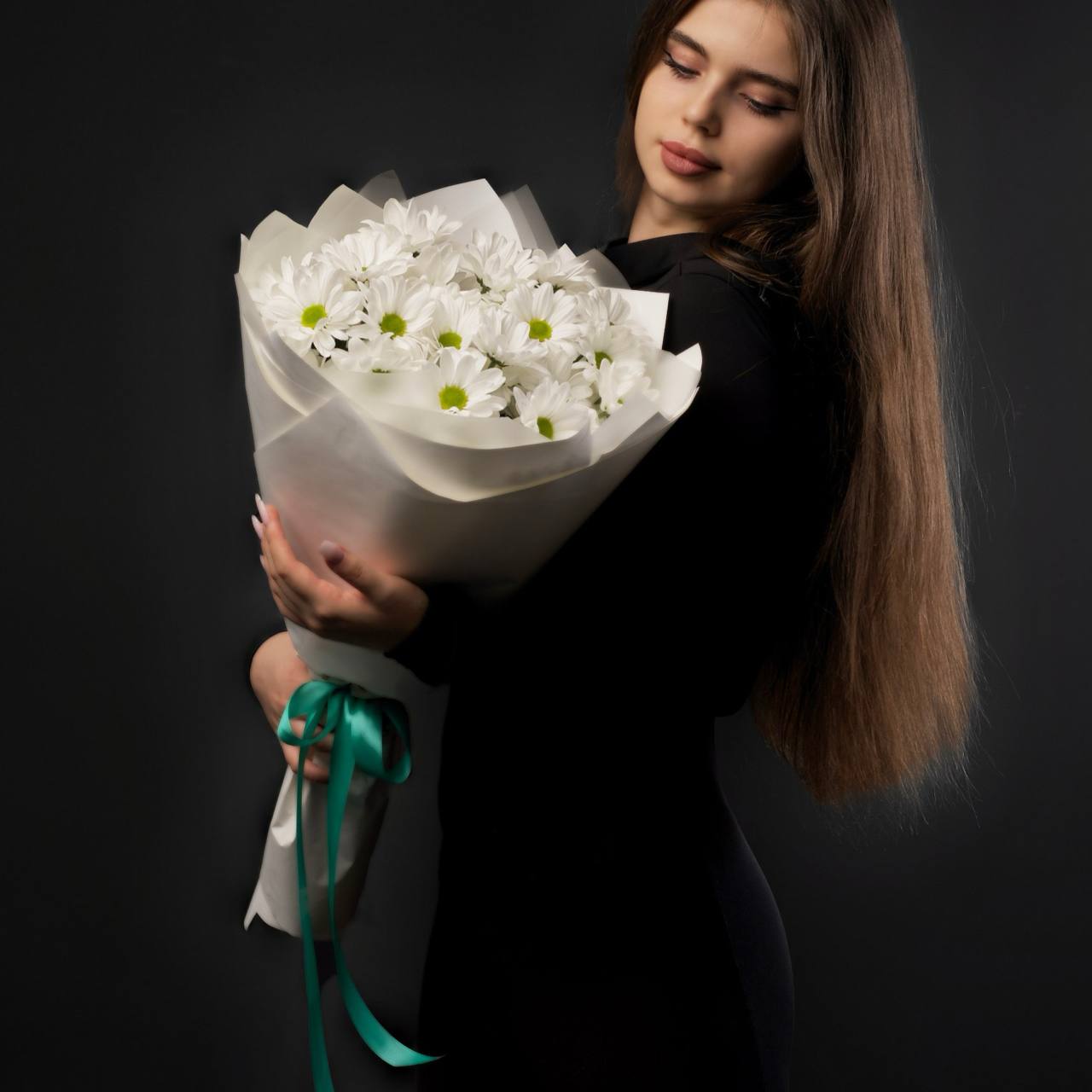 Букет из стойких кустовых хризантем в красивом оформлении.