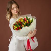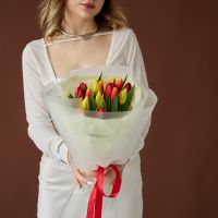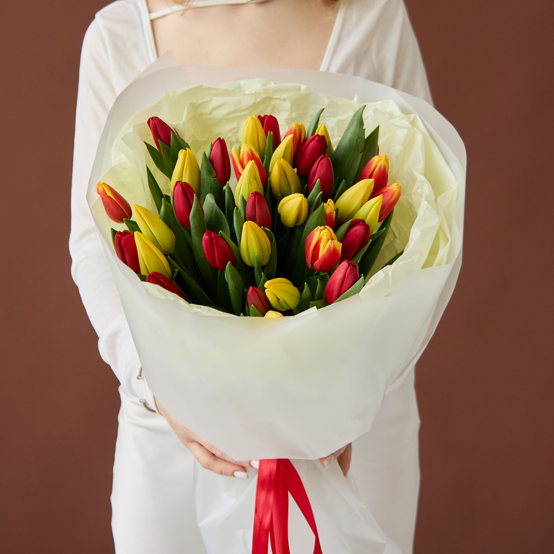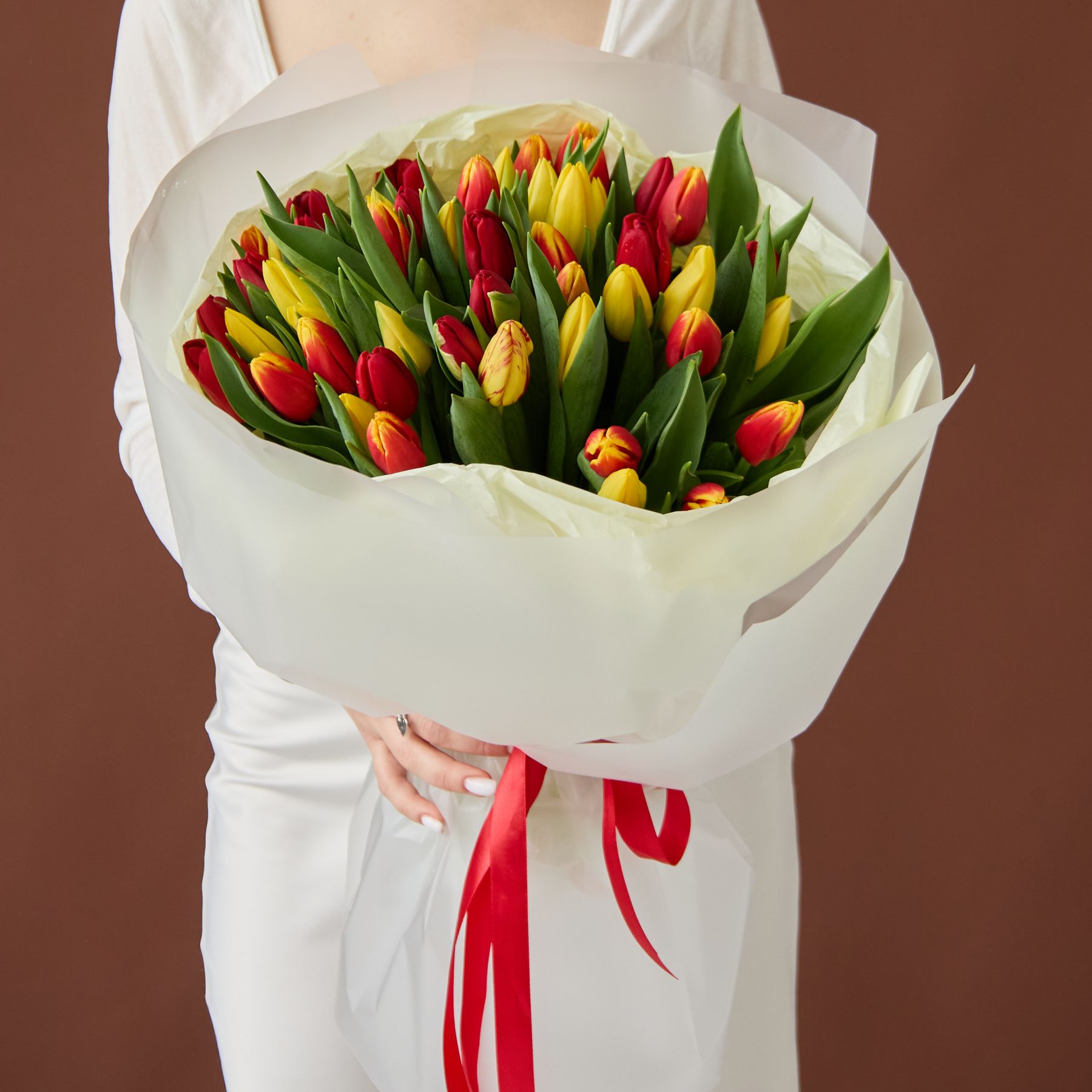 Красочный весенний букет. В составе тюльпаны цвета микс в красивой упаковке с атласной лентой.